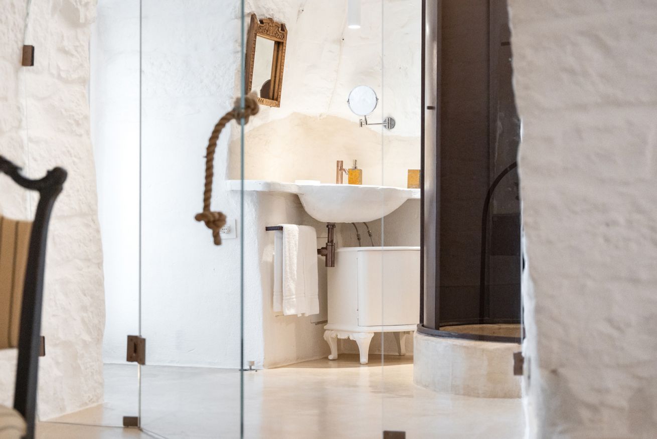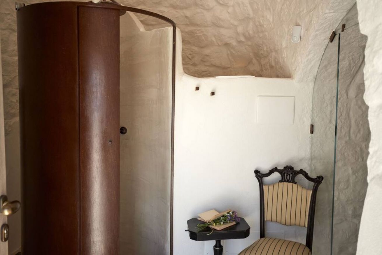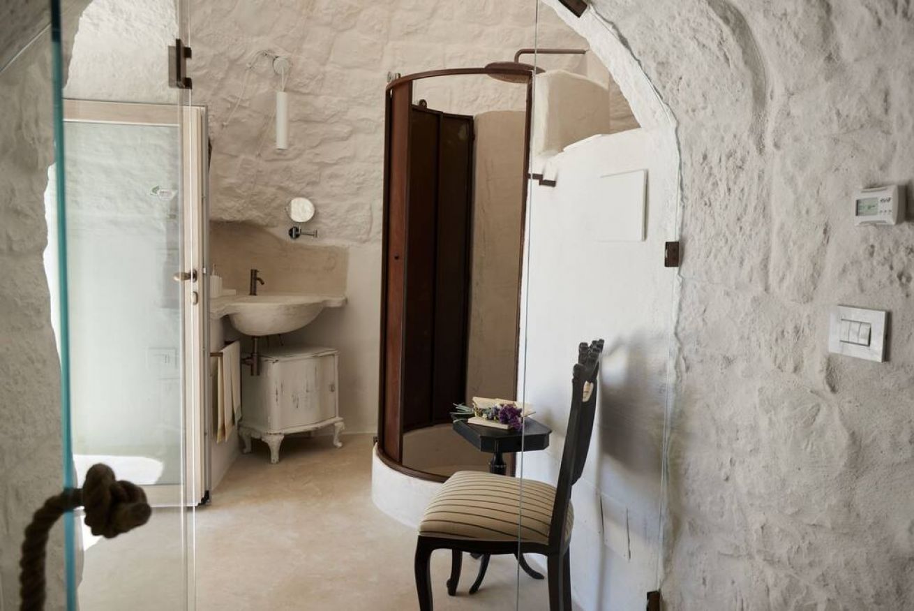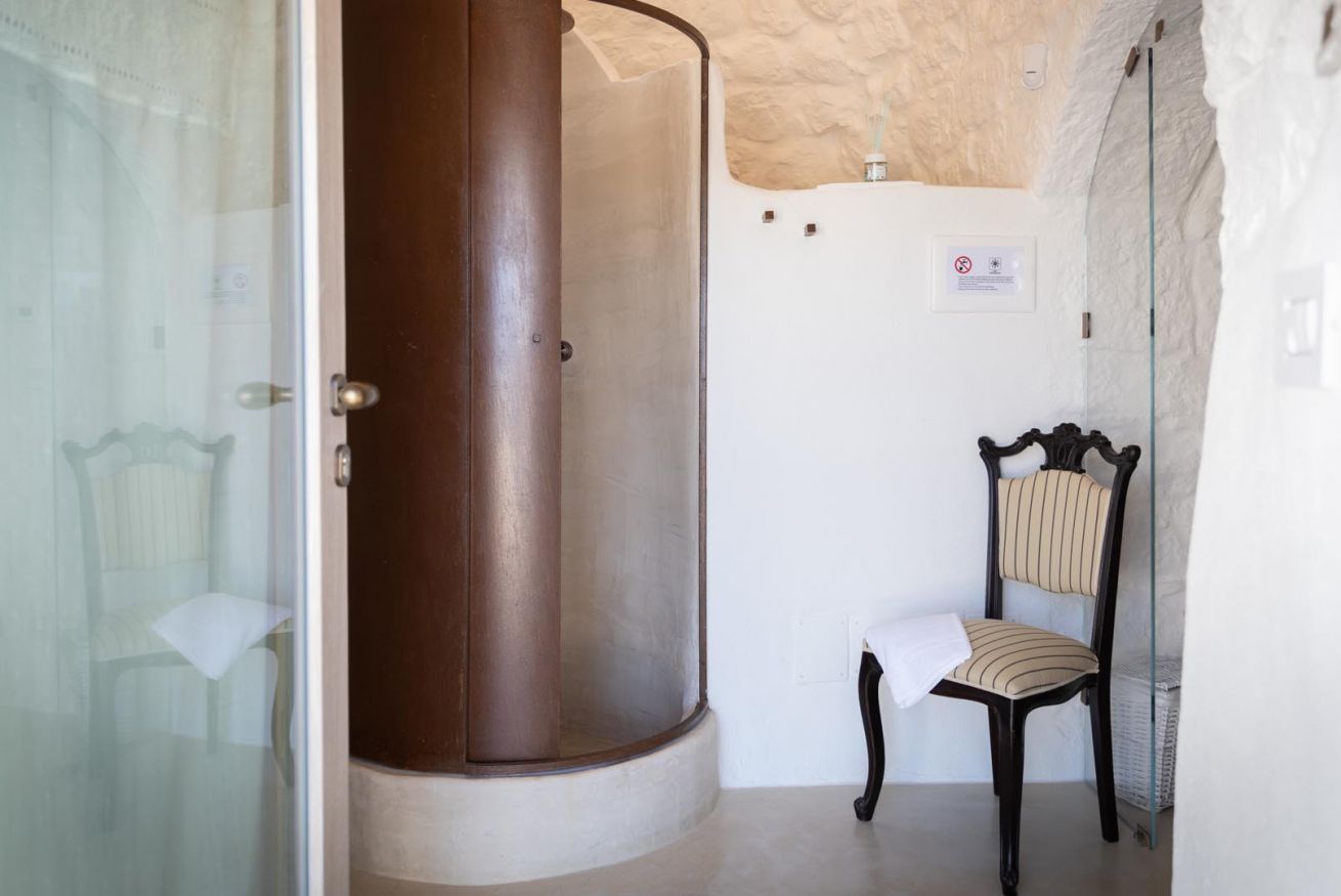 La Suite Focolare è una suite matrimoniale interamente scavata nella roccia. Il bagno è accessibile tramite una porta in vetro e la doccia ha forma cilindrica. Si estende su circa 25 m² ed è perfetta in ogni stagione. Infatti, che cerchiate sollievo dal calore esterno in estate, o riparo dal freddo in inverno, questa suite garantirà alla vostra vacanza in trullo tutti i comfort di cui avrete bisogno, ed in ogni periodo dell’anno!