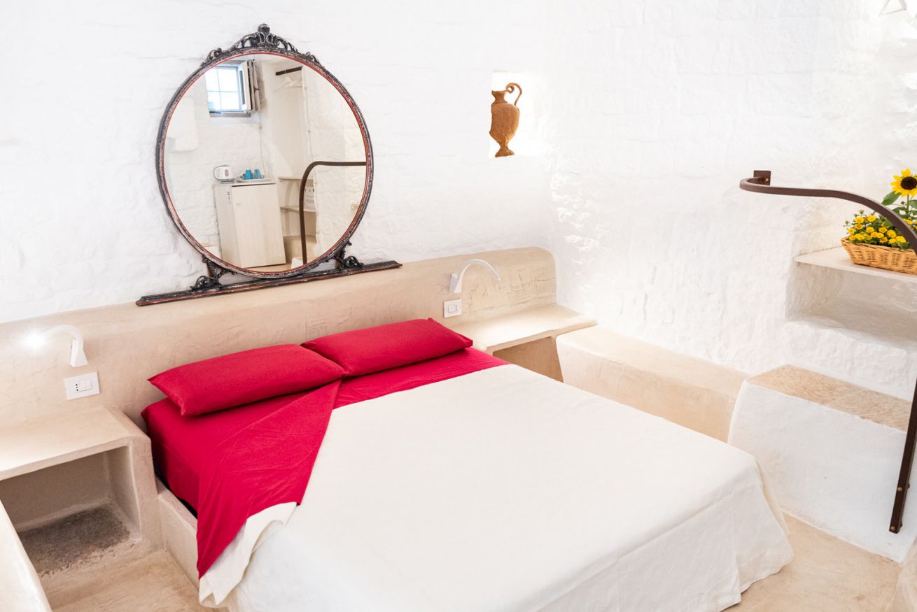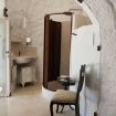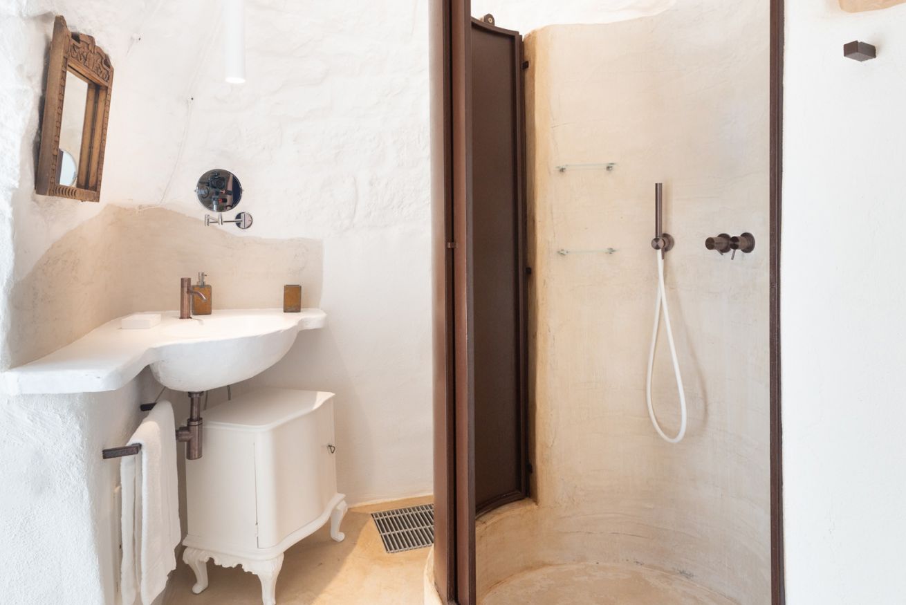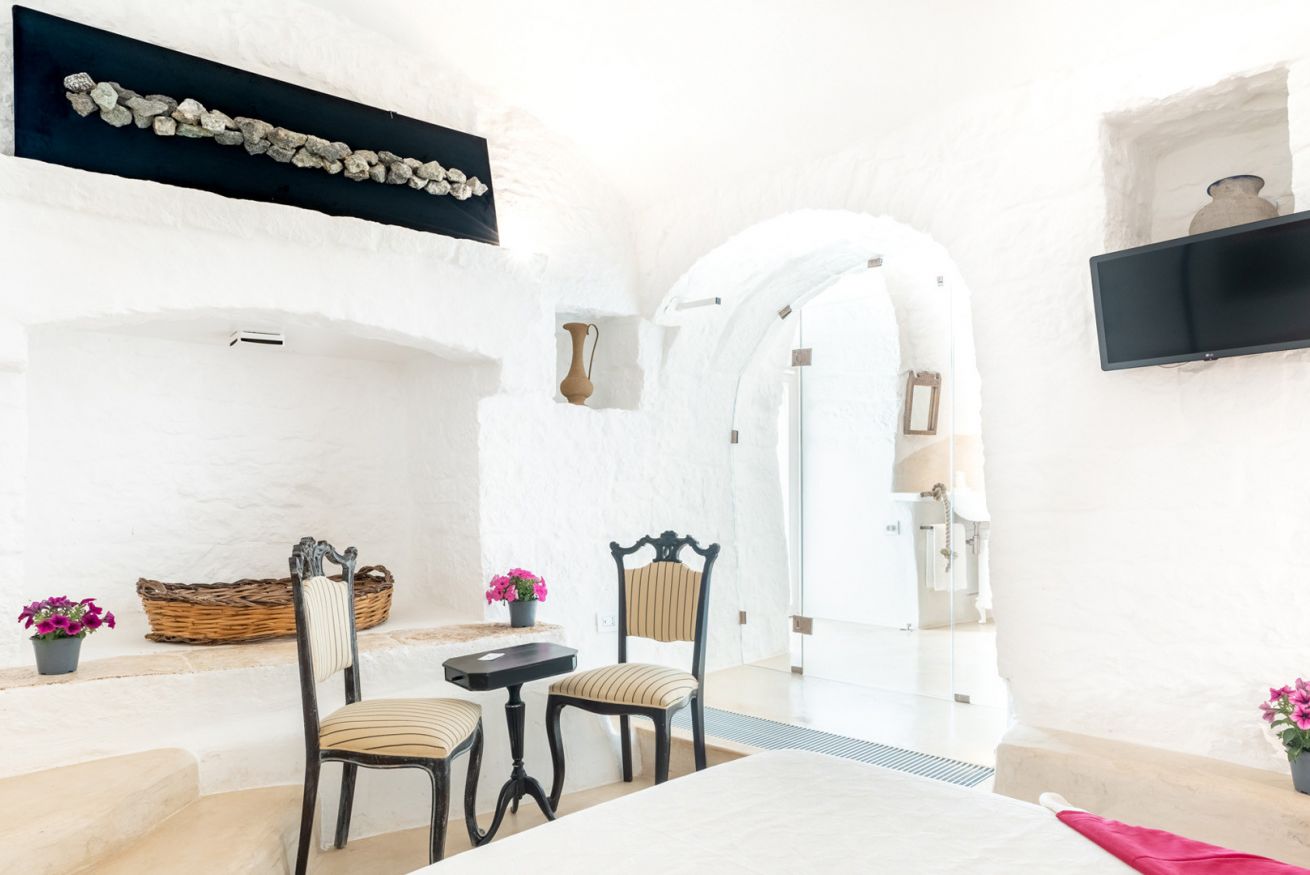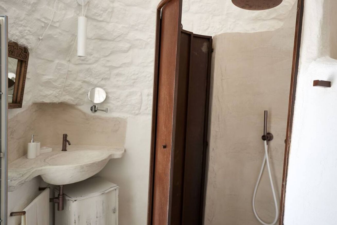 La Suite Focolare è una suite matrimoniale interamente scavata nella roccia. Il bagno è accessibile tramite una porta in vetro e la doccia ha forma cilindrica. Si estende su circa 25 m² ed è perfetta in ogni stagione. Infatti, che cerchiate sollievo dal calore esterno in estate, o riparo dal freddo in inverno, questa suite garantirà alla vostra vacanza in trullo tutti i comfort di cui avrete bisogno, ed in ogni periodo dell’anno!