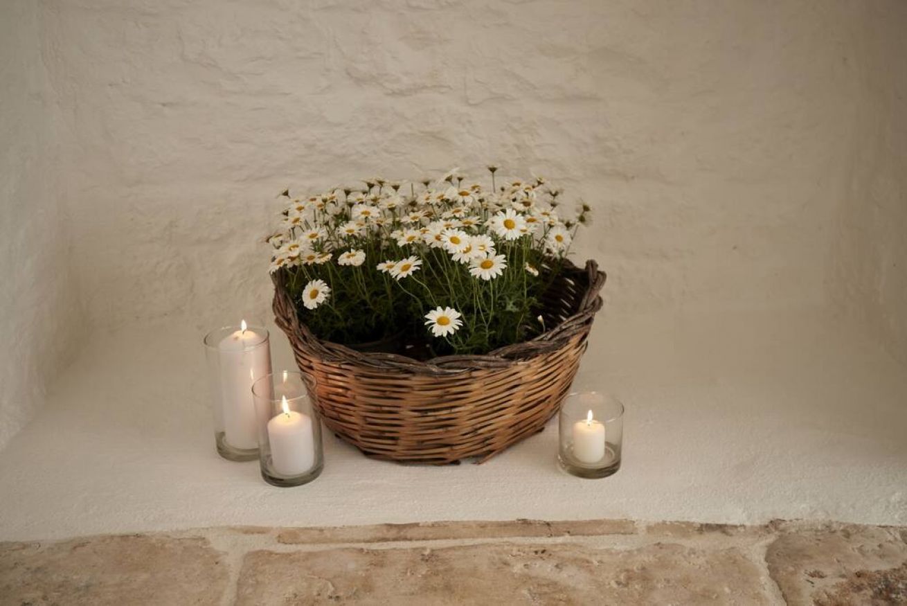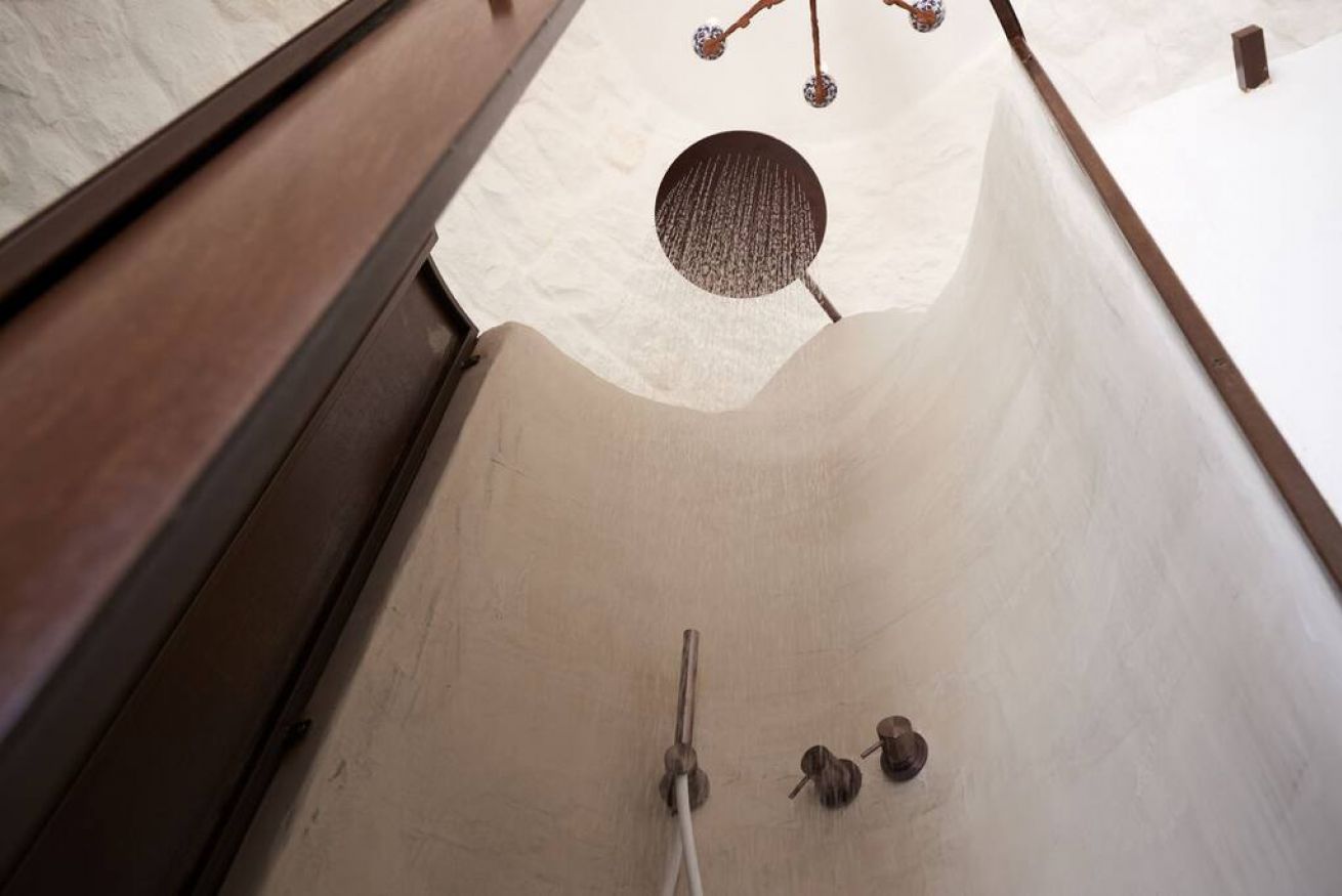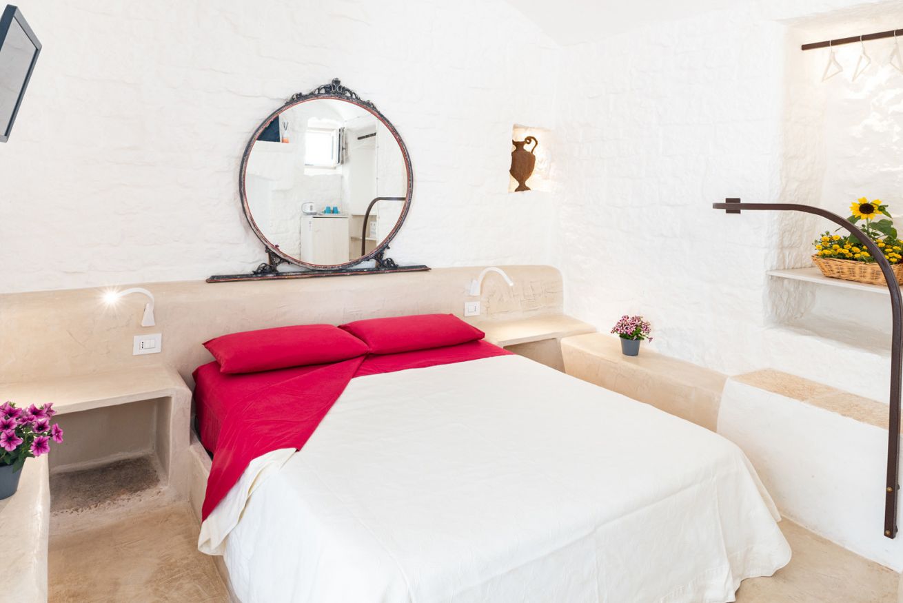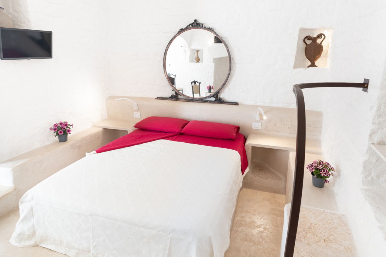 La Suite Focolare è una suite matrimoniale interamente scavata nella roccia. Il bagno è accessibile tramite una porta in vetro e la doccia ha forma cilindrica. Si estende su circa 25 m² ed è perfetta in ogni stagione. Infatti, che cerchiate sollievo dal calore esterno in estate, o riparo dal freddo in inverno, questa suite garantirà alla vostra vacanza in trullo tutti i comfort di cui avrete bisogno, ed in ogni periodo dell’anno!